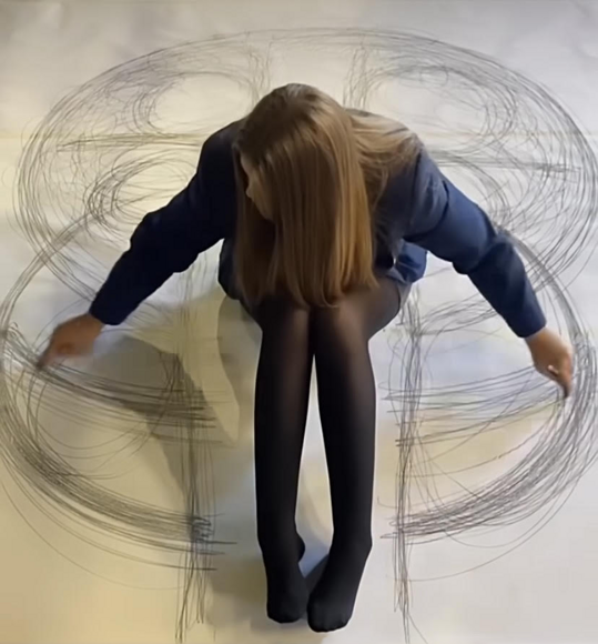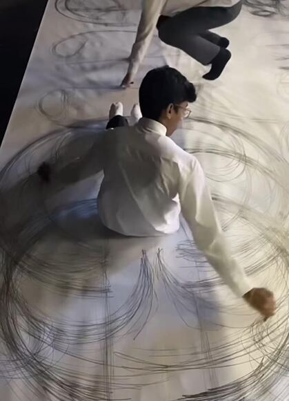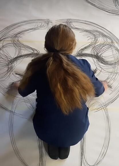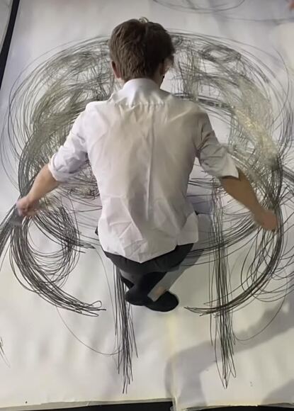 The exercise explored the theme of ‘Play’ and GCSE students were encouraged to participate in a kinetic performance inspired by the physical and geometric works of American artist, Heather Hansen. The school sourced large rolls of plain copier paper which were being discarded on Facebook marketplace by a local resident. The Hewett Academy Walter Roy Theatre stage was covered by this paper to create their canvas. Students were arranged around this area with graphite sticks and were then given loose instructions to mark their physical space with full-body movements.