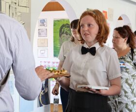 The Hewett Academy’s Catering Manager, Jackie Sweeney prepared a fantastic spread of appetisers for guests to the exhibition, including tomato salsa on bruschetta and smoked salmon blinis, which was served by students alongside drinks.